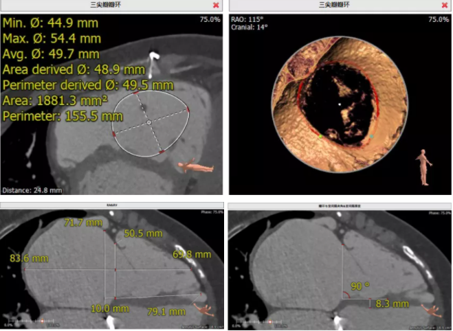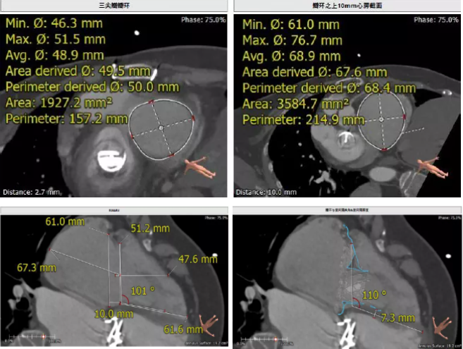 患者為68歲女性,14年前因“反復(fù)感冒、氣促”,檢查發(fā)現(xiàn)心臟瓣膜病,接受了“二尖瓣機(jī)械瓣置換術(shù)”。約5年前出現(xiàn)雙下肢水腫,活動后心累氣緊,心臟彩超提示:三尖瓣返流。近年來三尖瓣返流逐漸加重并伴有輕微黃疸、雙下肢水腫,雖長期服用利尿劑治療,但效果欠佳。郭惠明教授團(tuán)隊(duì)結(jié)合病史、超聲及CT評估,考慮患者瓣膜置換術(shù)后,三尖瓣重度返流,再次開胸行體外循環(huán)手術(shù)風(fēng)險高,經(jīng)團(tuán)隊(duì)整體評估,決定采用最適合患者的LuX-Valve三尖瓣置換系統(tǒng)行微創(chuàng)治療,根據(jù)測量結(jié)果選擇植入JS/TTVI-28-55型號的LuX-Valve瓣膜。
