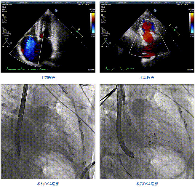 團(tuán)隊前期經(jīng)過多次討論,制定了周密的手術(shù)策略和預(yù)案。由于患者已是近九旬的超高齡老人,傳統(tǒng)外科開胸手術(shù)風(fēng)險極高,純介入經(jīng)血管三尖瓣替換能夠明顯減少創(chuàng)傷。術(shù)中陳茂及馮沅教授結(jié)合體表定位在造影指示下精準(zhǔn)穿刺右側(cè)頸靜脈并預(yù)置兩把血管縫合器。成功建立經(jīng)皮血管入路后在食道超聲和DSA的引導(dǎo)下順利完成人工瓣膜植入,術(shù)后超聲和造影顯示人工三尖瓣同軸性良好,瓣架固定牢靠,無反流和瓣周漏,平均跨瓣壓差降為1mmHg。術(shù)畢收緊預(yù)置的血管縫合器縫線完成止血,縫合效果滿意,在手術(shù)室即刻拔除氣管插管。