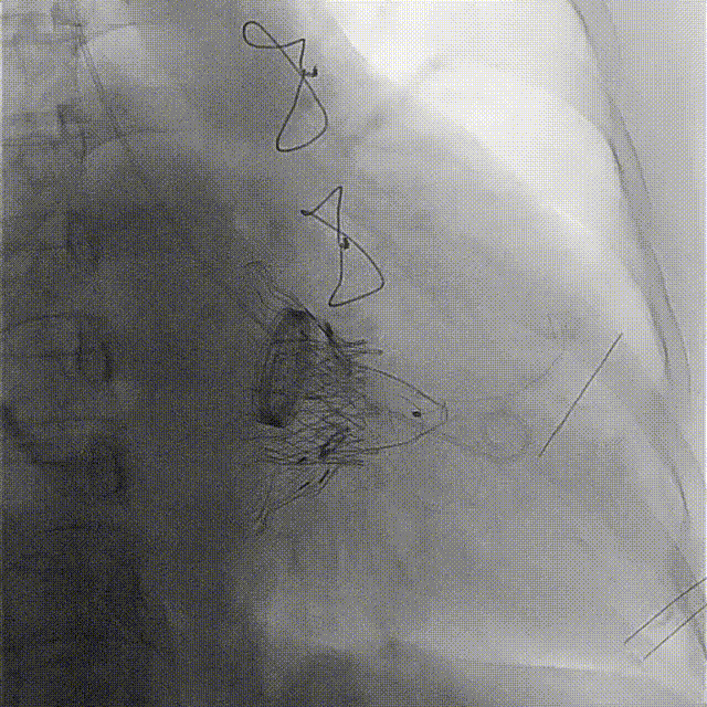 手術(shù)在全麻狀態(tài)下開展,海軍軍醫(yī)大學(xué)附屬長(zhǎng)海醫(yī)院陸方林教授與廈門心血管病醫(yī)院王焱院長(zhǎng)共同上臺(tái),為患者進(jìn)行手術(shù)。此次手術(shù)采用經(jīng)右側(cè)頸靜脈入路的方式將輸送器送入患者心臟內(nèi),在TEE及DSA引導(dǎo)下調(diào)整輸送器頭端角度,使得輸送器與三尖瓣瓣環(huán)平面垂直。在輸送器進(jìn)入右心室后釋放室間隔錨定裝置,而后釋放瓣葉夾持件(2個(gè)耳片結(jié)構(gòu))成垂直狀態(tài)。在TEE及DSA確定夾持件固定至三尖瓣葉根部且位于右室側(cè)后釋放人工瓣心房側(cè)盤片。隨后調(diào)整瓣膜同軸性以及室間隔錨定件位置(貼合室間隔),前推藏針管并固定,進(jìn)而釋放室間隔錨定裝置,并再次確認(rèn)瓣膜位置、穩(wěn)定性及同軸性,合攏輸送鞘后撤出輸送器,完成LuX-Valve Plus人工三尖瓣瓣膜的植入。