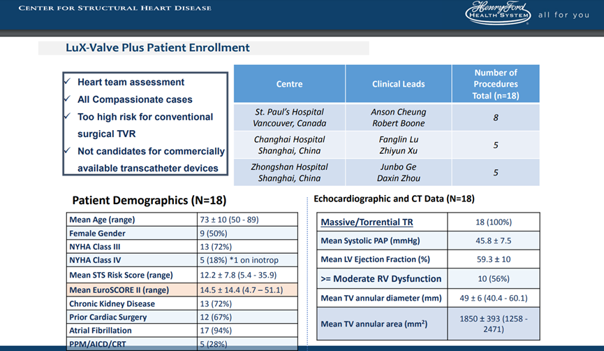 Dee Dee Wang教授首先介紹了LuX-Valve Plus救治性臨床研究隨訪30天結(jié)果。該研究在北美地區(qū)及中國(guó)地區(qū)同步開展,共納入18例患者,女性患者占比50%,患者平均年齡為73±10歲,心功能(NYHA分級(jí))均為Ⅲ級(jí)/Ⅳ級(jí);平均STS評(píng)分為12.2±7.8,平均EuroSCORE II評(píng)分為14.5±14.4。