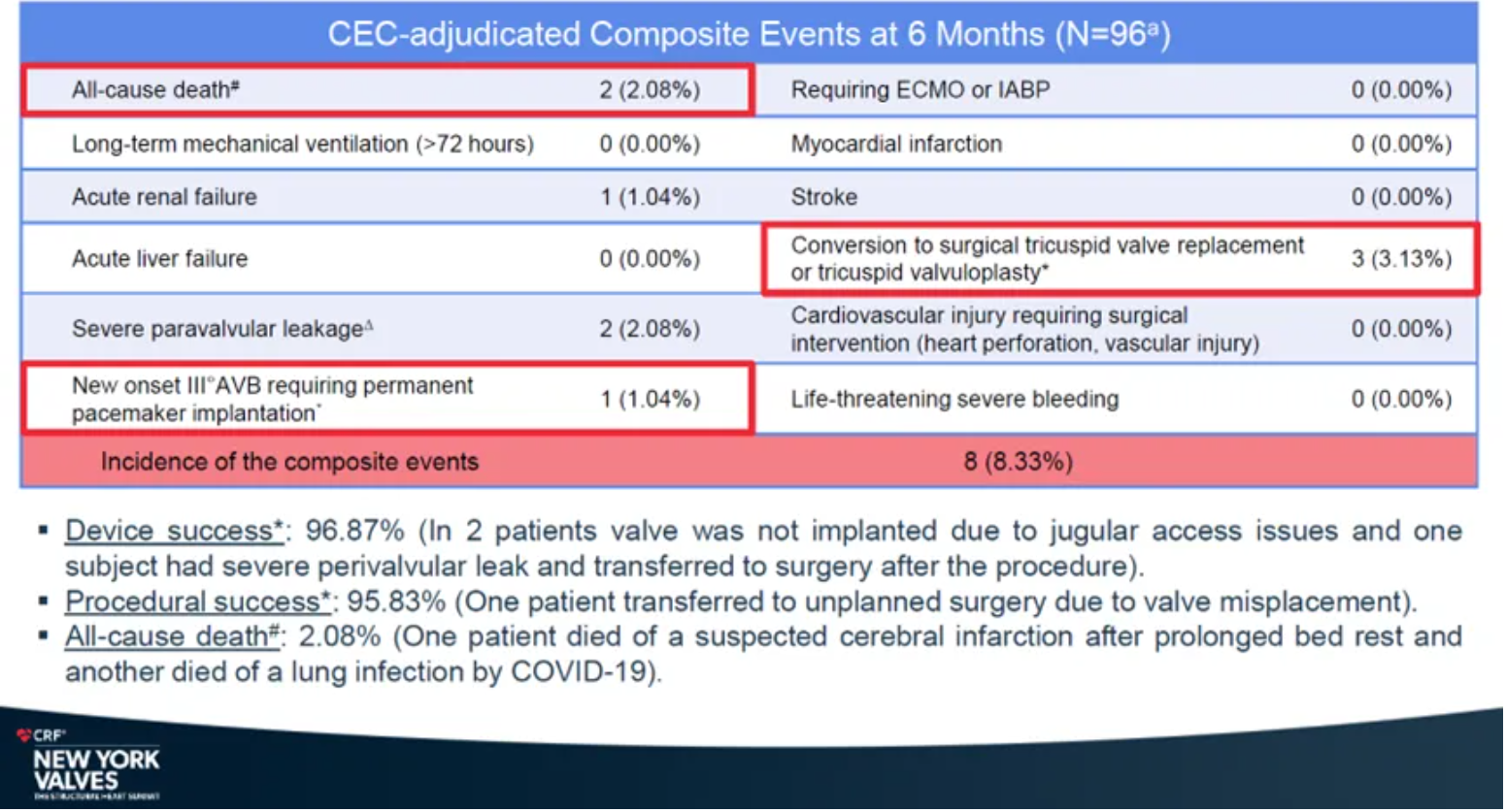 安全性結果顯示,復合事件發生率為8.33%。心梗、卒中、使用ECMO(體外膜肺氧合)或IABP(主動脈內球囊反搏)、急性肝功能衰竭、長期機械通氣(>72小時)、需要外科干預的心血管損傷(心臟穿孔、血管損傷)、危及生命的大出血事件發生率均為0。全因死亡率僅為2.08%,急性腎臟衰竭、重度瓣周漏和中轉外科三尖瓣置換或成形術發生率分別為1.04%、2.08%和3.13%。新發III度房室傳導阻滯需植入永久心臟起搏器的發生率僅1.04%。