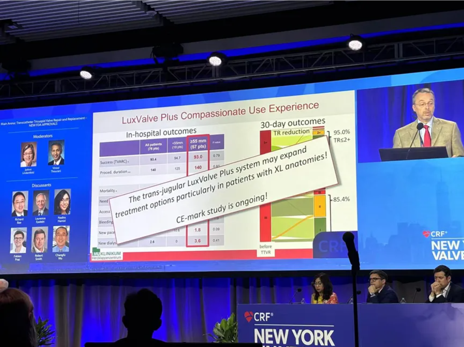 來自美國紐約蒙特法沃醫療中心(Montefiore Medical Center, New York, U.S.)的Azeem Latib教授在分享TTVR研究時高度贊揚LuX-Valve Plus。他在分享中講到,TTVR器械能完全消除三尖瓣反流,并且顯著改善癥狀和生活質量,能夠成為第一線的治療方式。其中,LuX-Valve Plus的30天數據顯示94.1%的患者反流等級降低至2+及以下,88.3%的患者NYHA心功能等級恢復至I/II級。與此同時,一些TTVR器械的臨床試驗也出現了較高的嚴重出血率和較高的起搏器植入率,然而LuX-Valve Plus卻依然展現了較低的起搏器植入率。在最后,Latib教授總結道,正確的患者及器械篩選,以及合適的學習曲線可以有效降低并發癥。