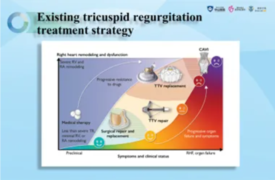 長久以來,隨著學術領域對于三尖瓣返流認知的加深,從解剖學到影像學,從傳統藥物治療到外科手術治療,針對三尖瓣返流的微創介入技術一直是學界關注的熱點話題之一。結合三尖瓣返流所并發的右心系統結構改變,魏來教授首先闡述了現有介入手術器械在不同解剖條件及不同疾病發展進程中所面臨的挑戰。作為現有的三尖瓣返流介入治療方案,三尖瓣TEER療法往往受限于三尖瓣返流所帶來的特殊解剖變異,如瓣環擴張、瓣葉裂隙過大等。
