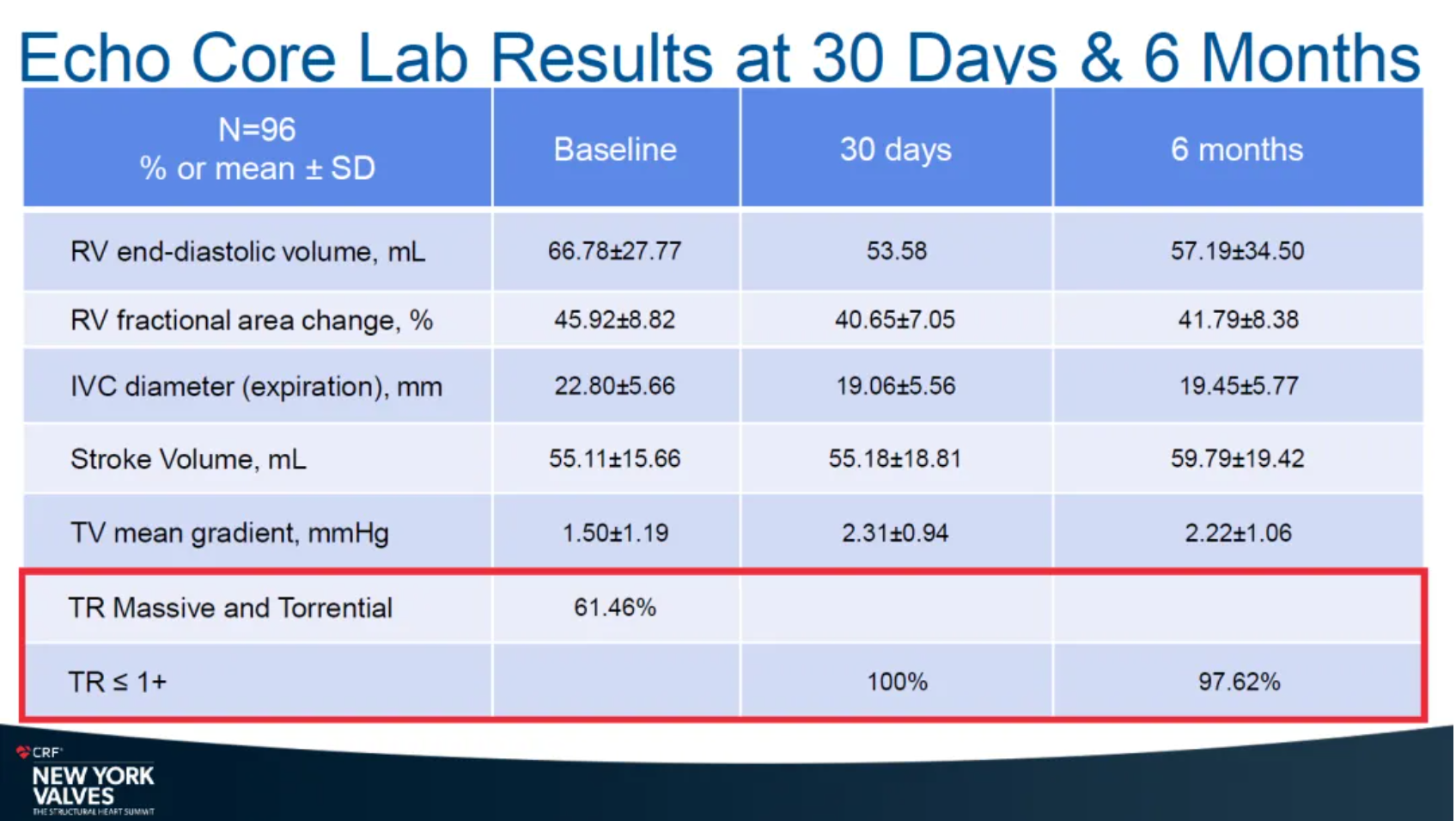 術后即刻和30天的數據依然展現了優異的治療結果。首先,術后即刻患者的反流等級得到改善,94.7%的患者恢復到≤2+,新發起搏器的植入率僅為3.9%。隨后,30天的數據顯示,患者反流等級顯著降低,95%的患者恢復至≤2+,NYHA心功能等級持續提升,85.4%的患者提升至術后的I/II級。此外,超聲影像也顯示患者右心系統重塑獲益。