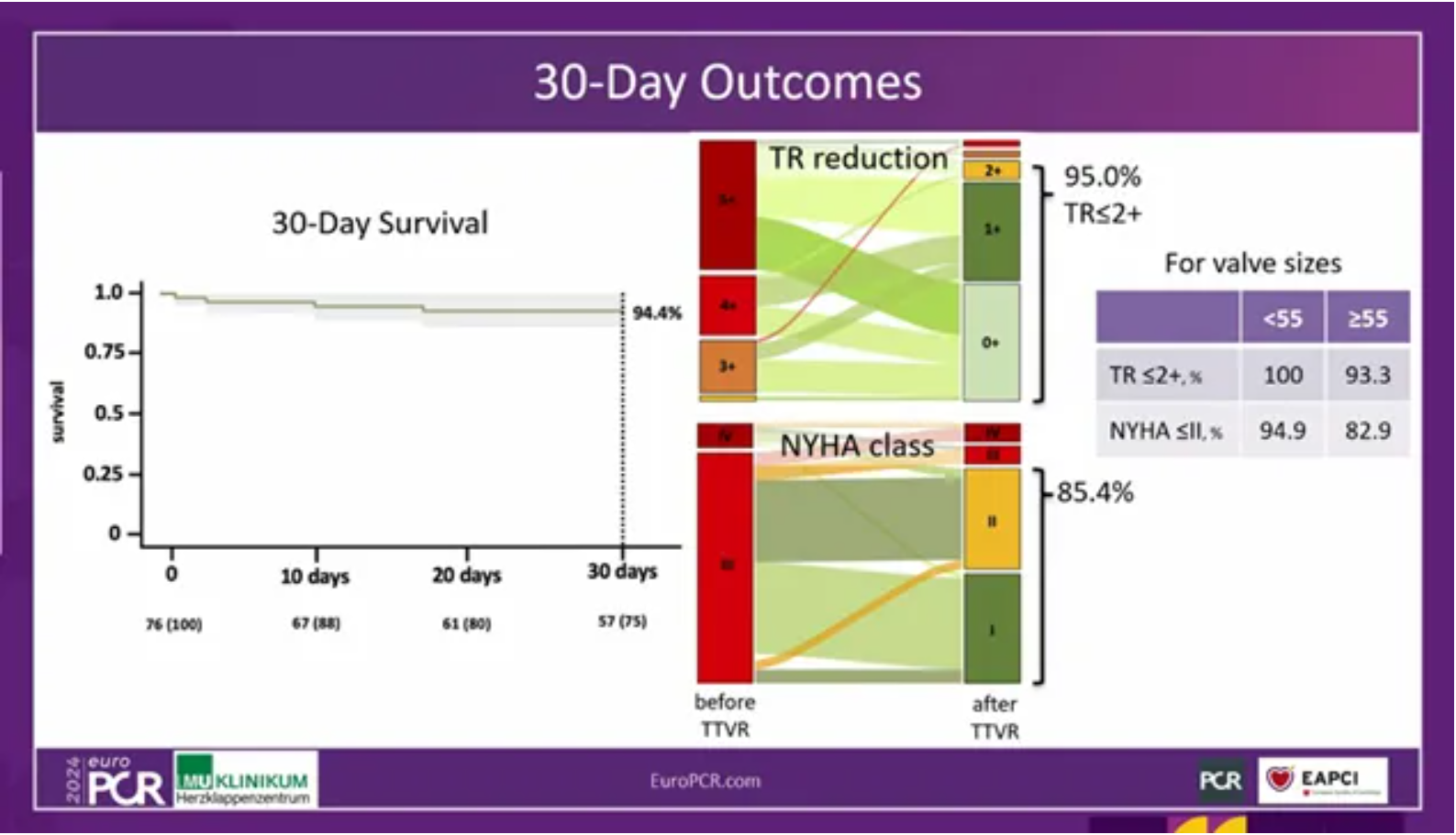 Hausleiter教授總結道,同情救治使用數據展現了經頸靜脈入路的LuX-Valve Plus系統對于反流等級的降低是安全有效的;而且對于小瓣環患者(<55mm)和大瓣環患者(≥55mm)具備可比較的意義,這意味著三尖瓣置換(TTVR)對于晚期三尖瓣反流并有著大尺寸右心室的患者是可行的。