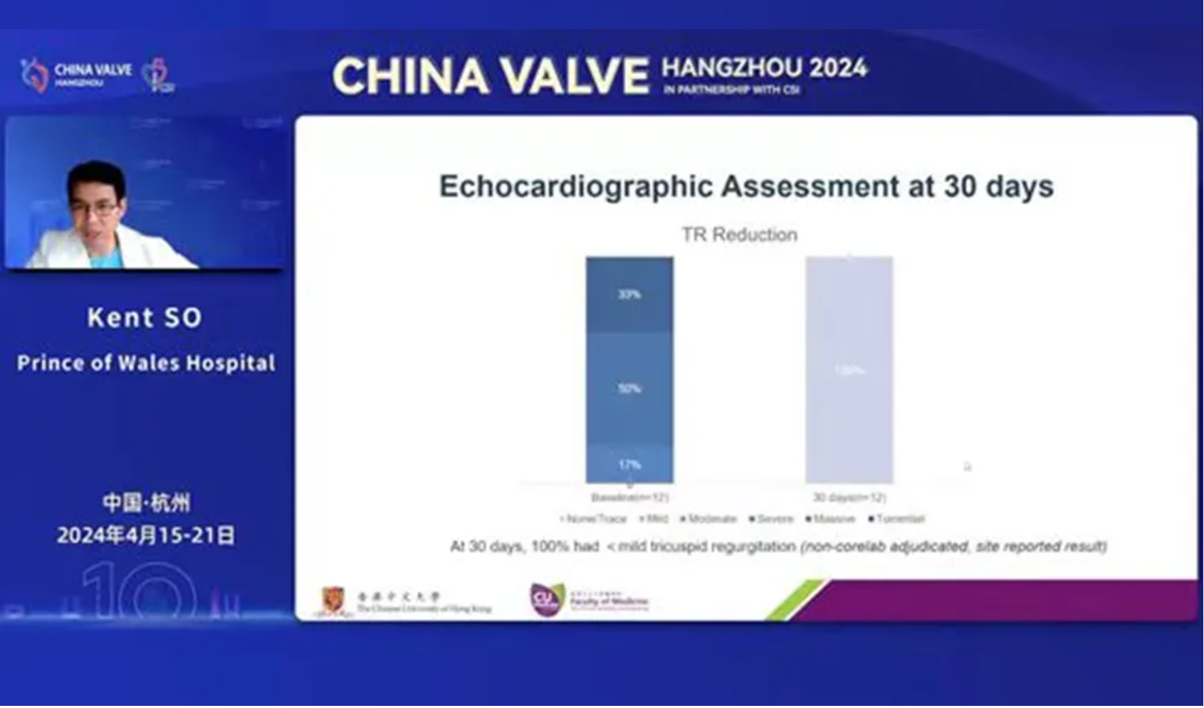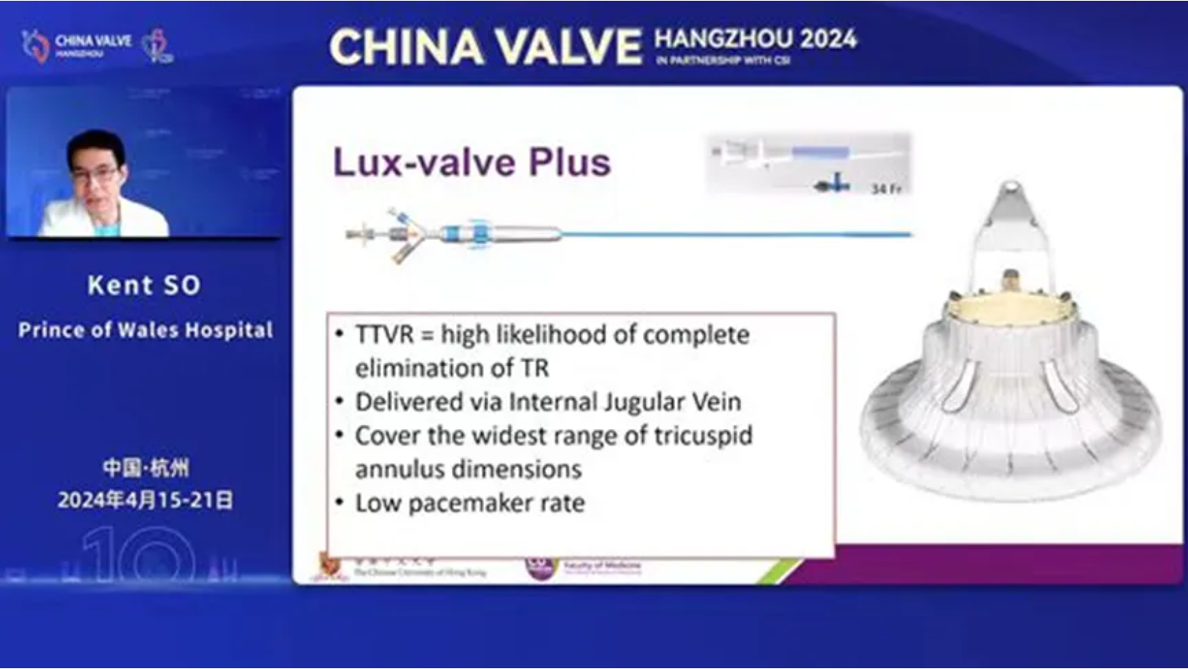 LuX-Valve Plus早期在香港的臨床數據和經驗由來自中國香港威爾斯親王醫院(Prince of Wales Hospital, Hong Kong, China)的Kent SO(蘇澤宇)教授在2024杭州瓣膜會上進行了分享,并且指出這是一款有潛力的TTVR器械,能覆蓋較廣范圍的三尖瓣瓣環尺寸并帶能降低起搏器的植入率,展現了良好的術中和短期治療效果。