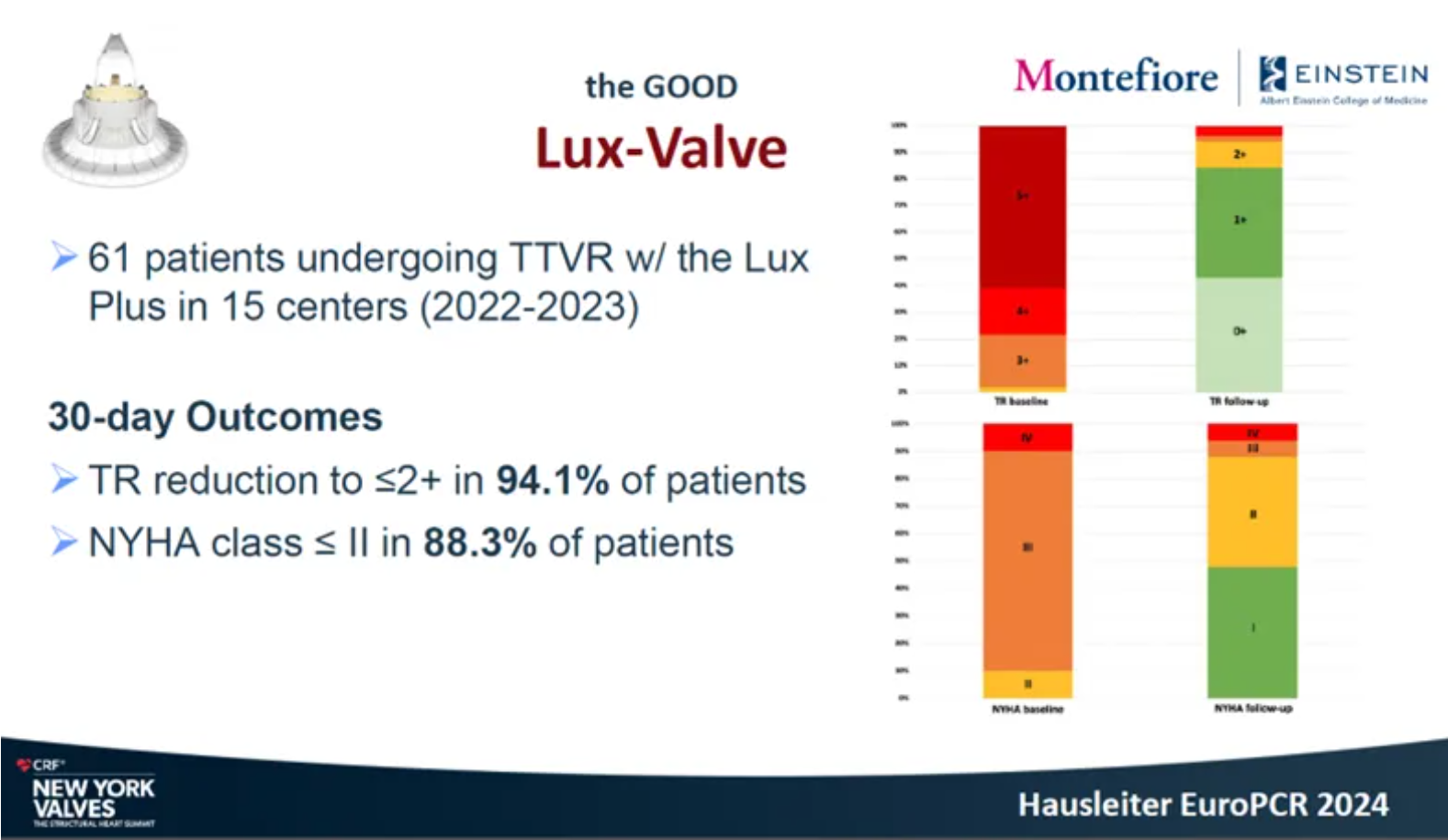 隨后在2024年紐約瓣膜會上,Hausleiter教授再次提及LuX-Valve Plus,并介紹到對于不適合做T-TEER術式的患者也是適用的,并且能夠擴大治療方式的選擇,例如瓣口接合有較大缺陷和超大瓣環的患者,以及超聲影像質量較低不適合夾子術式等情況。Hausleiter教授表示LuX-Valve Plus展現了優異的的早期臨床表現。