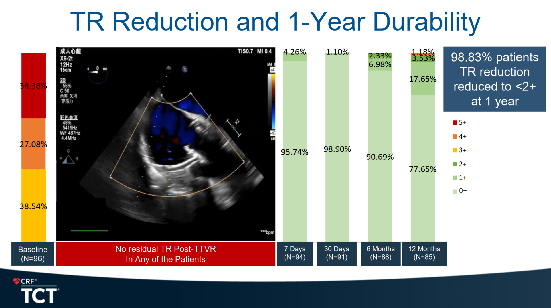 有效性結果顯示,患者的返流等級、心功能等級,以及生活質量顯著改善。所有受試者在30天顯示無中度及以上返流,95.30%的患者在1年期時顯示無中度及以上返流。同時,根據(jù)超聲數(shù)據(jù)顯示,患者右心系統(tǒng)重構也獲得受益。