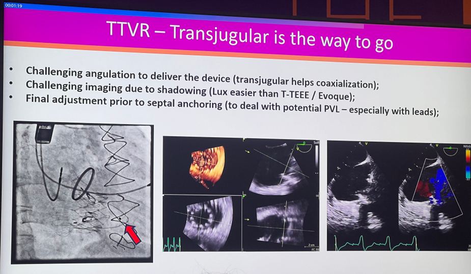 巴西圣保羅(Rede D'Or São Luiz, São Paulo, Brazil)的 Vinicius Esteves 教授結合了二例 LuX-Valve Plus 的植入案例探討了經頸靜脈入路在TTVR中的優(yōu)勢。通過對比傳統(tǒng)經股靜脈入路和經頸靜脈入路,經頸靜脈入路因為更短的路徑可以減少手術風險、縮短手術時間,并顯著降低術后并發(fā)癥;且更易對瓣膜的軸向性進行調整,以降低瓣周漏的發(fā)生。同時,由于經頸靜脈入路并未產生更多的血管并發(fā)癥,越來越多的三尖瓣置換器械也在進行經頸靜脈入路的探索,展現了三尖瓣置換未來趨勢的一種可能性。LuX-Valve Plus作為頸靜脈入路TTVR器械的早期探索者,積累了非常豐富的臨床經驗。